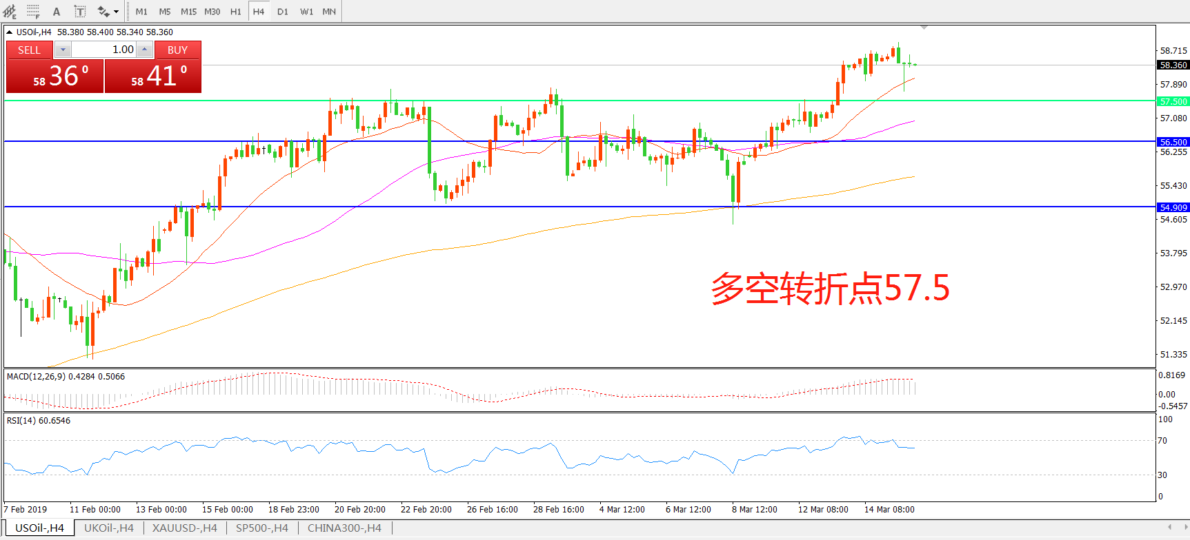 4小时图看,油价突破57.5后维持高位盘整,长针探底形态显示21均线支撑依然有效,均线系统呈多头排列,MACD红柱缩短,RSI指标掉头迹象,短期有出现回调可能。