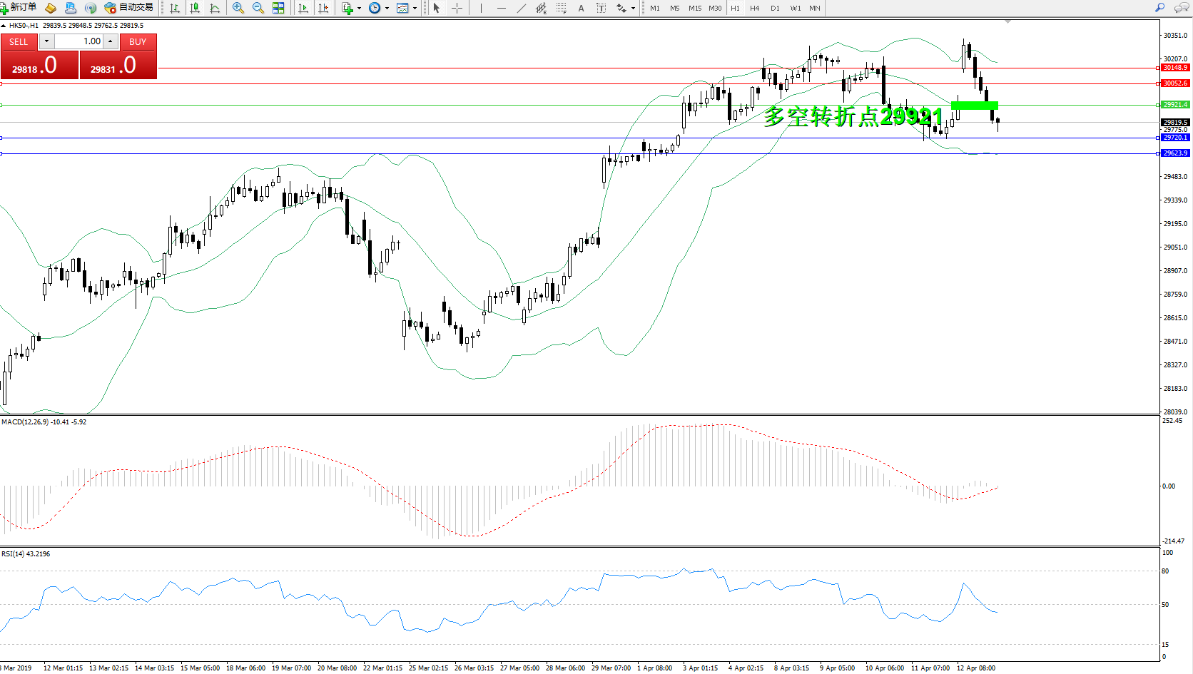 香港股市周一收跌,中国和全球经济增长放缓的迹象抵消了围绕中美贸易谈判的乐观情绪以及中国银行业贷款数据跳升的利好。恒生指数 .HSI 收跌99.04点或0.33%,报29,810.72点,恒生国企指数 .HSCE 收跌0.24%,至11,631.86点。主要随中美两市牵引震荡向上,中国及美国释放的宽松货币政策给港市场带来充足流动性,港股上周反复上试并站上30000点整数关口,市场交易较活跃。现外围美股收涨,美企财报靓丽冲淡市场对全球经济放缓担忧,不过欧美摩擦加剧引发市场避险升温,惟中国央行周末再释放积极信号有望提振内港两地,因此,料港股短期高位震荡。