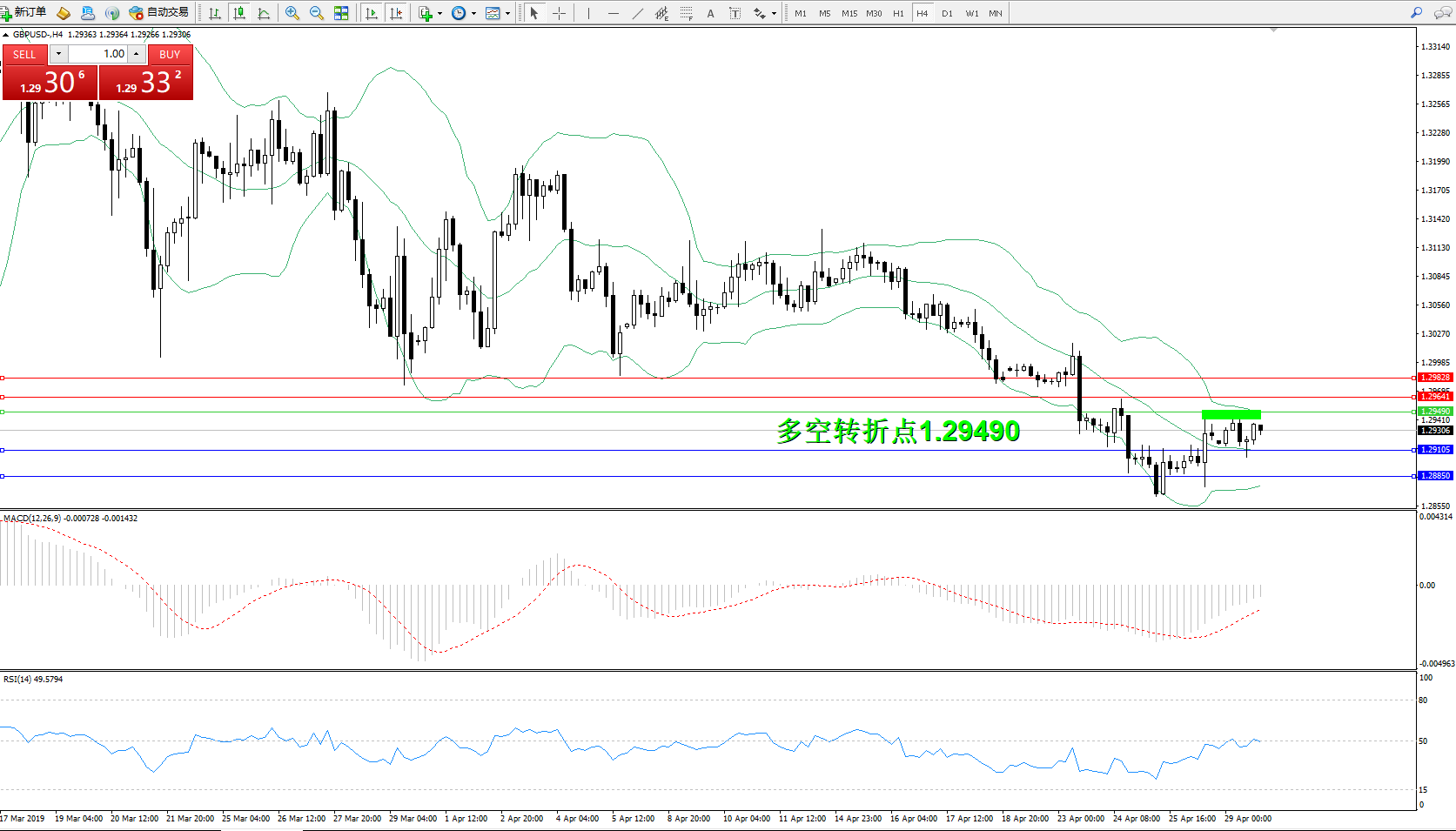 交易策略:1.29490下方看跌,目标1.29105、1.28850