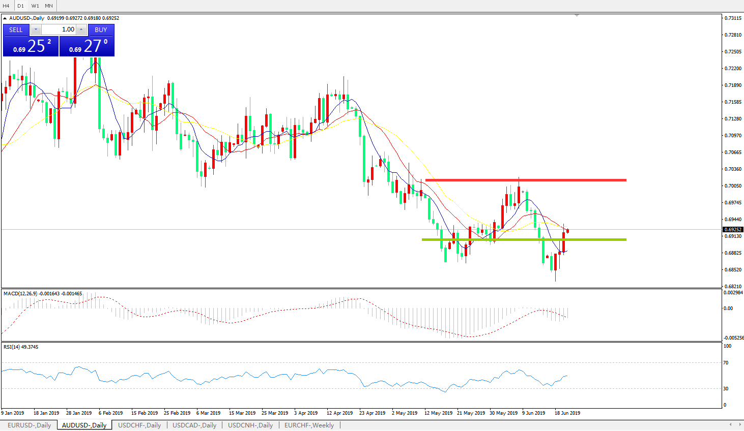 技术面简析:日图均线有序空头排列,但价格昨日反弹较为强劲,MACD0轴下方运行且动能柱缩量,RSI逐步反弹走高,汇价在贸易战及美联储货币政策影响下反弹,但中期依旧考虑逢高做空。