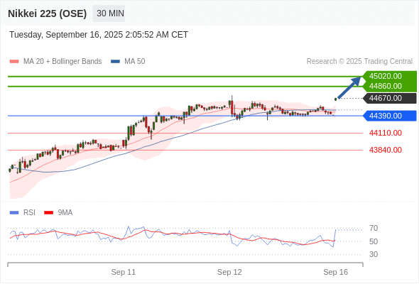 在 44390.00 之上,看涨,目标价位为 44860.00 ,然后为 45020.00 。