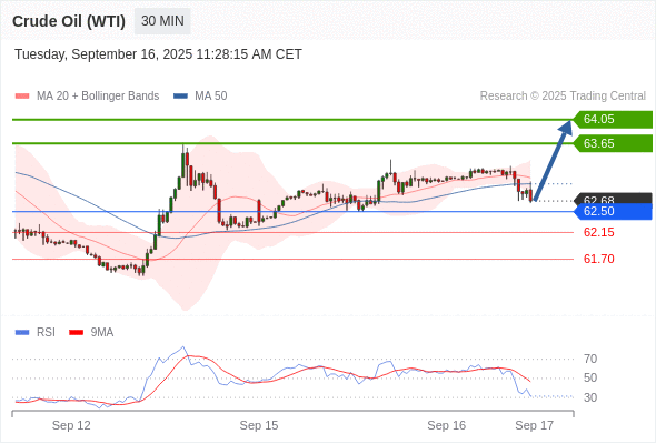 在 62.50 之上,看涨,目标价位为 63.65 ,然后为 64.05 。