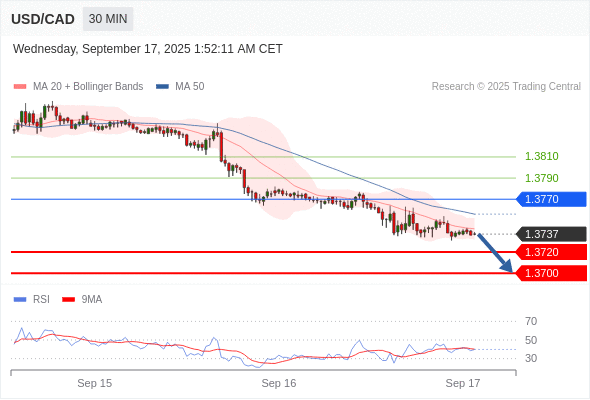 在 1.3770 之下,看跌,目标价位为 1.3720 ,然后为 1.3700 。