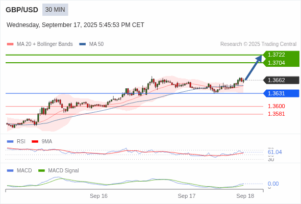 英镑/美元 当日内 : 看涨,当 1.3631 为支撑位。