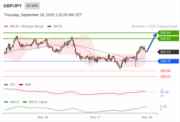 英镑/日元 当日内 : 看涨,当 199.79 为支撑位。