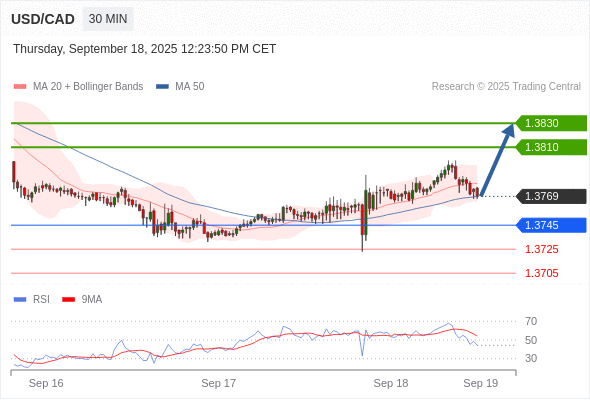 在 1.3745 之上,看涨,目标价位为 1.3810 ,然后为 1.3830 。