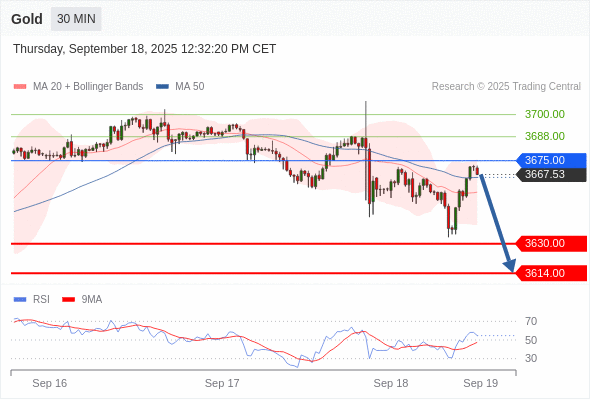 交易策略: 在 3675.00 之下,看跌,目标价位为 3630.00 ,然后为 3614.00 。