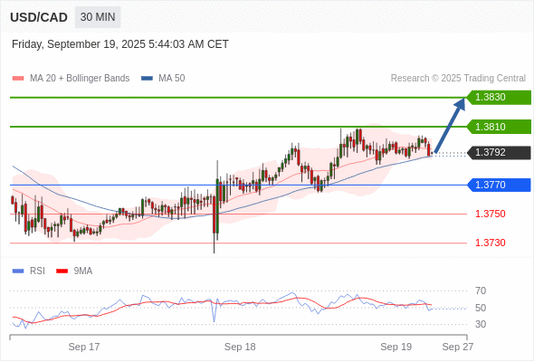 在 1.3770 之上,看涨,目标价位为 1.3810 ,然后为 1.3830 。