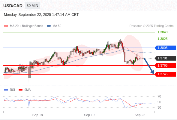 在 1.3805 之下,看跌,目标价位为 1.3765 ,然后为 1.3745 。