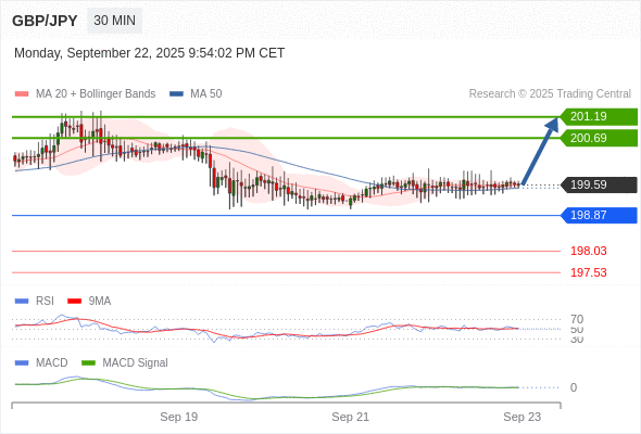 备选策略: 如跌破 198.87 ,GBP/JPY 目标方向定在 198.03 和 197.53 。