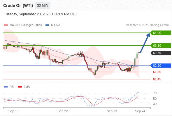 在 62.20 之上,看涨,目标价位为 63.30 ,然后为 64.00 。