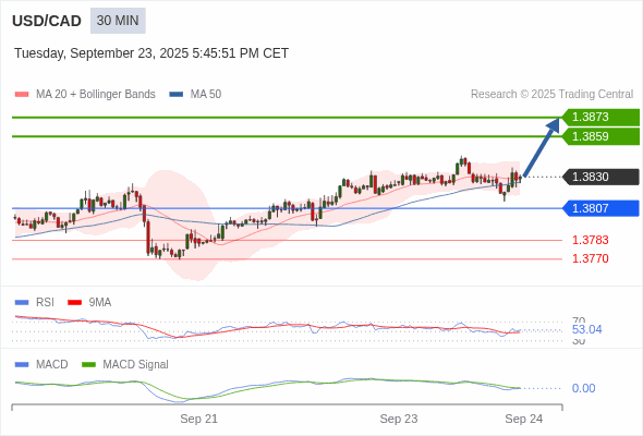 美元/加元 当日内 : 看涨,当 1.3807 为支撑位,目标定在1.3873。
