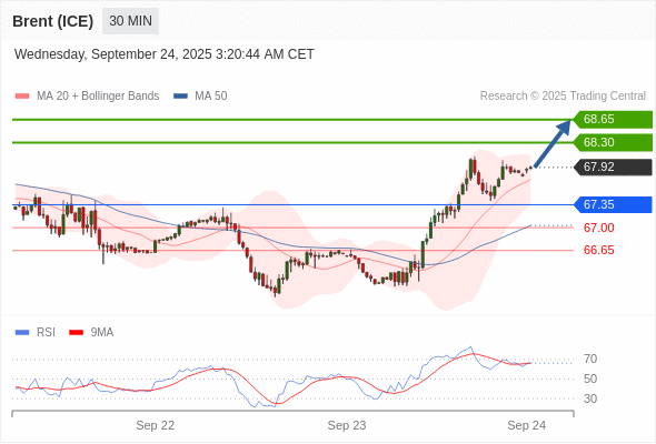在 67.35 之上,看涨,目标价位为 68.30 ,然后为 68.65 。