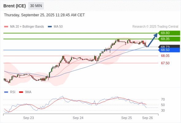 在 68.50 之上,看涨,目标价位为 69.35 ,然后为 69.80 。
