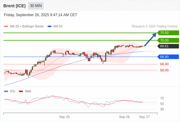 在 68.90 之上,看涨,目标价位为 70.00 ,然后为 70.50 。