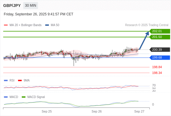 英镑/日元 当日内: 看涨,当 199.68 为支撑位,目标定在202.01。