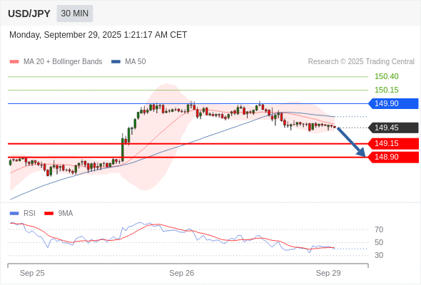 在 149.90 之下,看跌,目标价位为 149.15 ,然后为 148.90 。