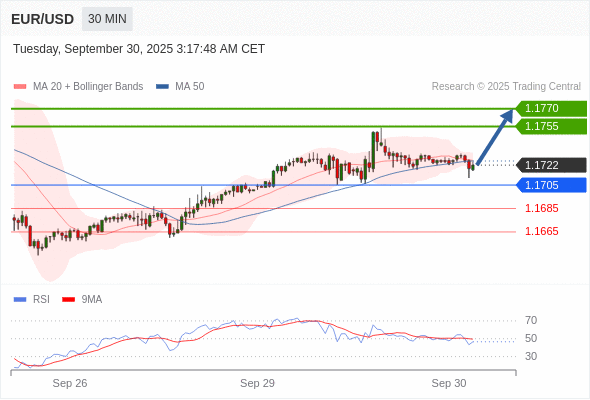 在 1.1705 之上,看涨,目标价位为 1.1755 ,然后为 1.1770 。