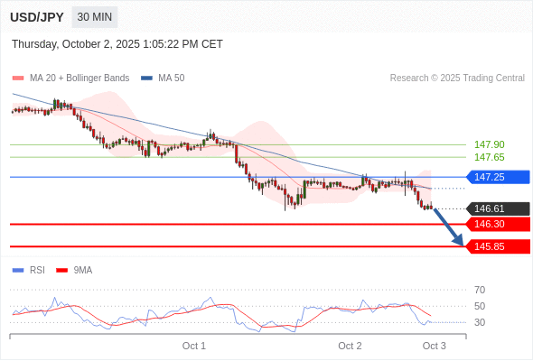 在 147.25 之下,看跌,目标价位为 146.30 ,然后为 145.85 。