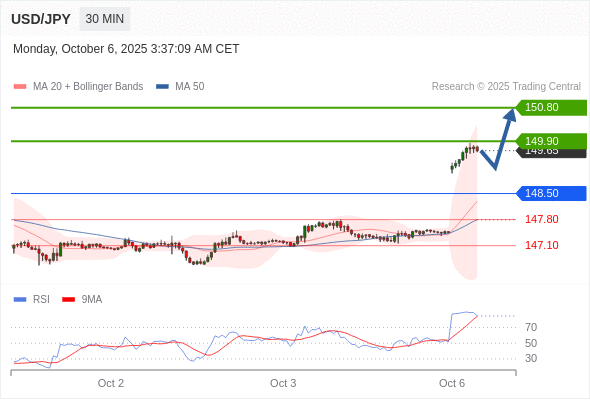 在 148.50 之上,看涨,目标价位为 149.90 ,然后为 150.80 。