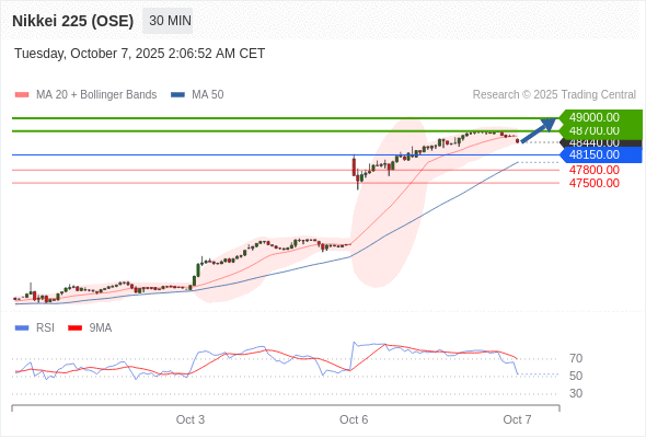 日经225股指期货 (OSE) 当日内: 在48150.00之上,看涨。