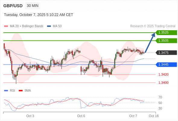 在 1.3445 之上,看涨,目标价位为 1.3505 ,然后为 1.3525 。