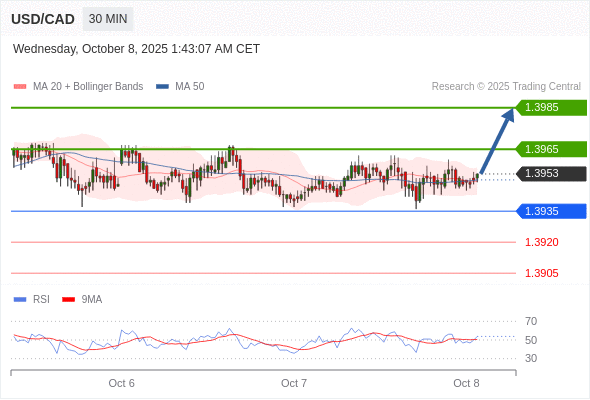 在 1.3935 之上,看涨,目标价位为 1.3965 ,然后为 1.3985 。