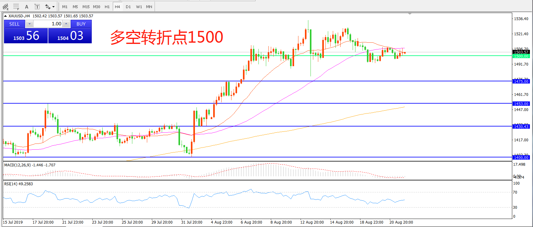北京时间周四(8月22日)凌晨02:00,美联储公布的7月会议纪要显示,美联储决策者一致认为,在决定未来是否降息方面,“保持可选性很重要”;他们青睐由未来的信息指导政策,“避免有任何遵循预设路径的表现,这令市场对美联储进一步降息的预期下降,纪要公布后,美元指数小幅上扬;金价盘中短线剧烈震荡,但始终守于1500美元/盎司之上,最终收报1502.94美元/盎司。金价在连续大幅上涨之后,目前仍然处在回落调整的周期中。