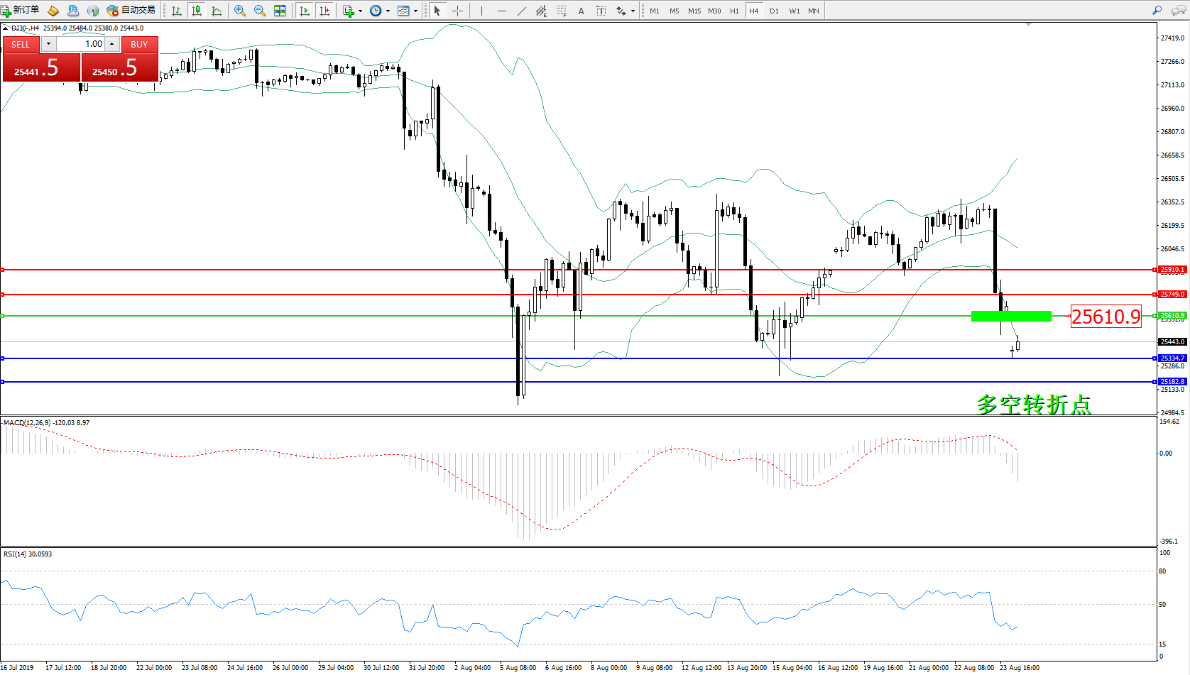 道琼斯指数823日(周五)收盘下跌623.30点,跌幅2.37%,报25628.90点。市场仍在关注重新趋紧的全球贸易关系及美联储主席鲍威尔的讲话。鲍威尔称美国经济面临重大风险,将采取适当行动维持美国经济增长。市场认为鲍威尔保持宽松政策的大门敞开。中国宣布对美国的关税政策采取反制措施,对近750亿美元美国商品加征关税。特朗普连发12条推特。要求美国企业尽快停止在中国进行采购。不过,美国商会似乎并不理会总统的“推特圣旨”。
