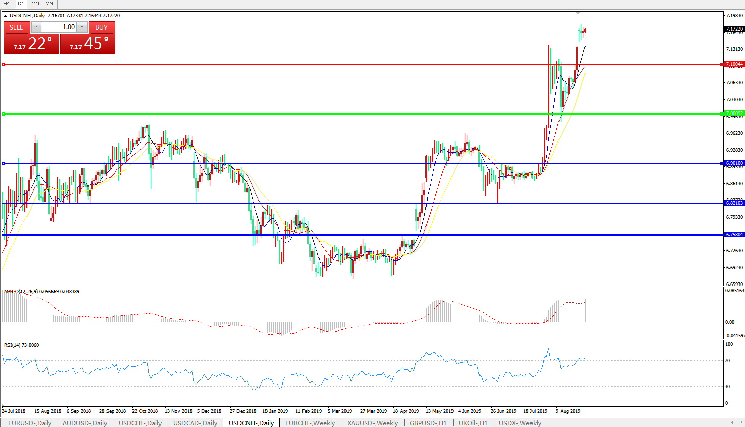 技术面简析:日图均线呈有序多头排列,汇价高位维持攻势,MACD运行在0轴上方且动能有再度放量迹象,RSI超买区域有再度走高迹象,预计汇价将维持攻势,重点关注7.20-7.30区间的压制;中美贸易战后续进展决定汇价中期走势。