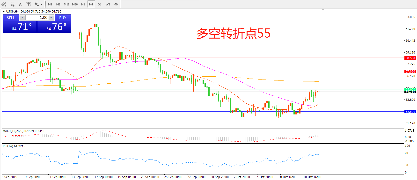 4小时图看,油价企稳后震荡走高,55美金成为短期阻力,均线系统有拐头迹象,整体走势有所回暖,MACD红柱增加,RSI指标向上,日内延续上行概率较大。