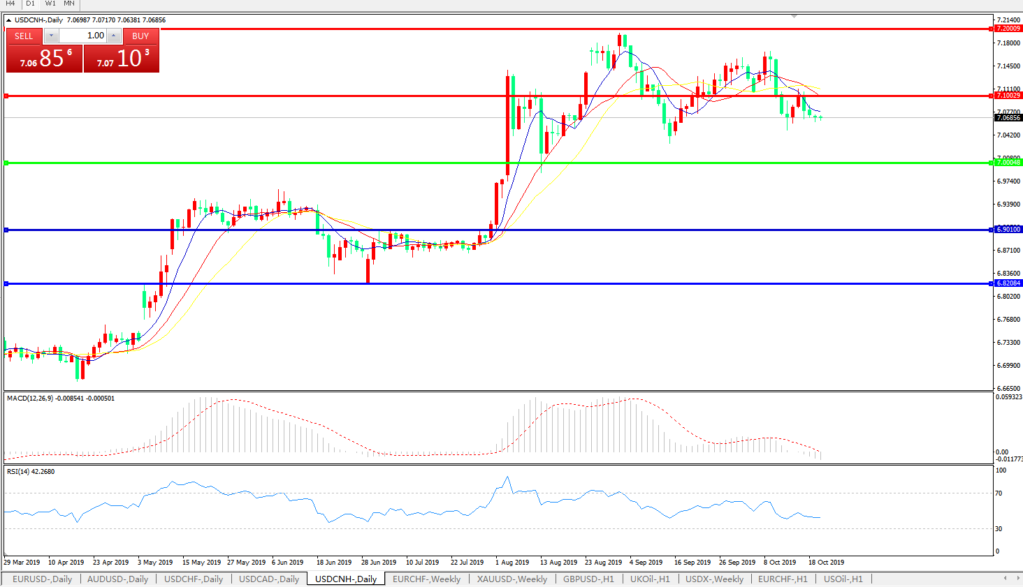 技术面简析:日图短期均线呈空头排列,汇价7.10关口承压持续小幅回落下修,MACD快速逼近0轴且量能0轴下方放量,RSI再度走低,预计短期汇价将延续宽幅整理态势,汇价运行于7.00-7.10区间的概率较大;中美贸易后续谈判进展将决定汇价最终趋势。