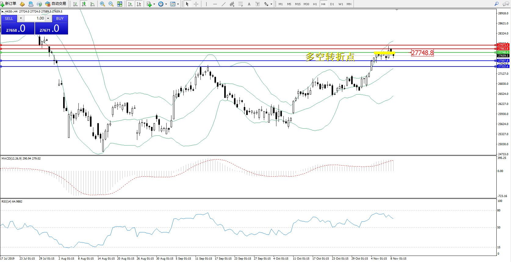 香港恒生指数11月8日(周五)收盘下跌196.09点,跌幅0.70%,报27651.14点;恒指高开低走收跌0.7%,本周涨2%。地产、医药、科网股领跌,汽车股逆市上涨。目前港股市场的估值水平处在历史较低水平,具备良好的投资价值,如有国内经济能企稳回升,恒生指数有望继续震荡上行。全球经济及美国经济增速放缓预期的增加,美联储货币政策转向更为明确。