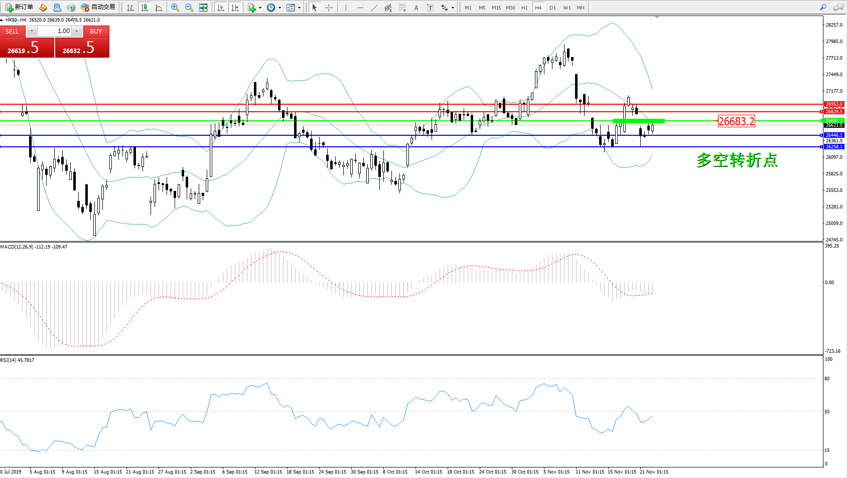 香港恒生指数11月22日(周五)收盘上涨128.20点,涨幅0.48%,报26595.08点;港股高开118点后,再续有买盘支持,并逐步向上,恒指高见26690,高位见压力,再收窄升幅至收市。中方邀请美国官员前往北京再续谈判。经贸前景不确定性增强,市场也是开启观望模式,进入初步防御状态,预计恒指仍会继续调整。