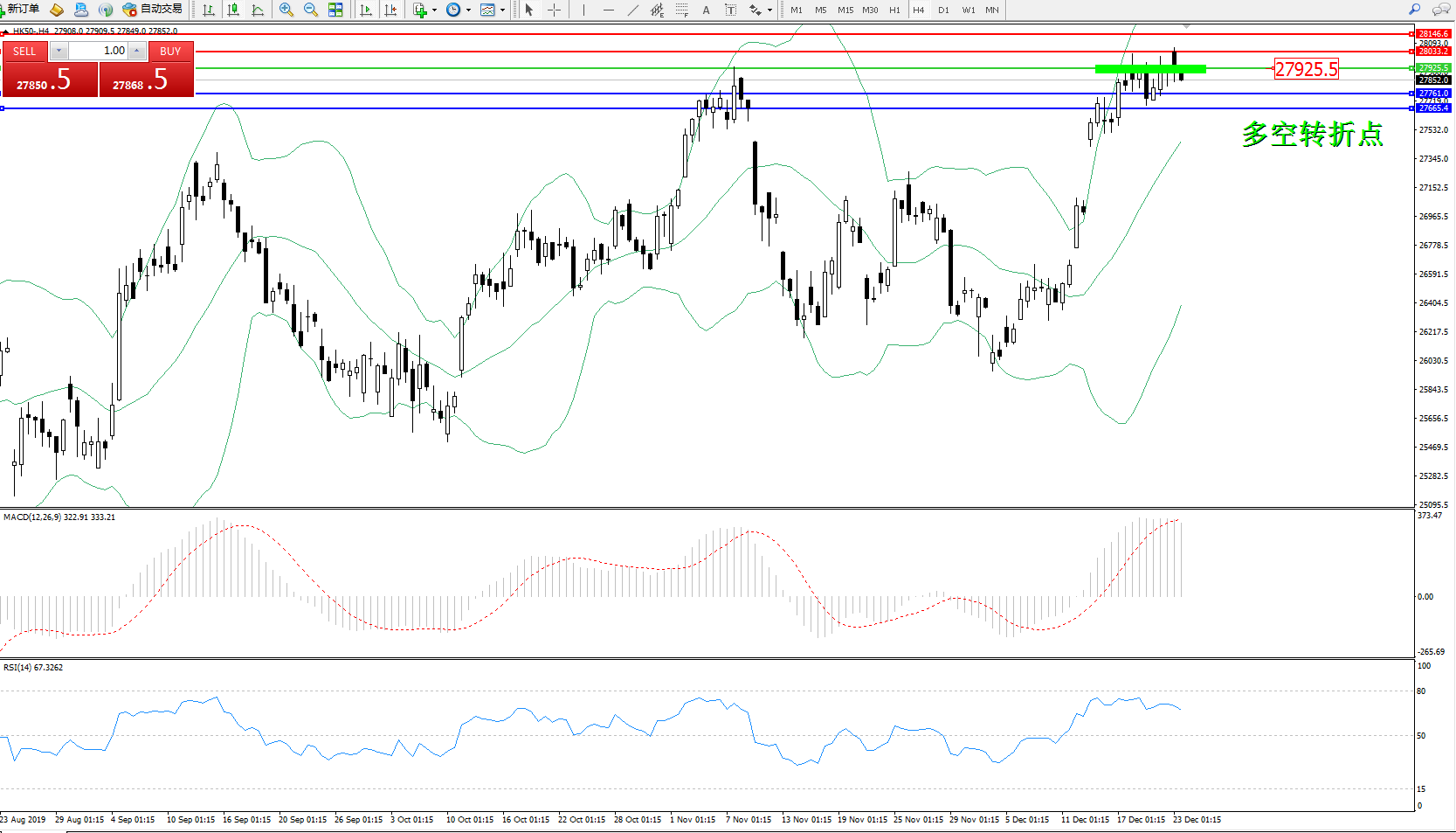 香港恒生指数1223日(周一)收盘上涨35.06点,涨幅0.13%,报27906.41点;港股跟随外围造好而高开153点,恒指高见28024,直冲上28000关口,但已见是日高位。沽盘即见涌出,恒指先收窄升幅,再回落倒跌41点,低见27830。本周,市场迎来大的假期圣诞节,预计整体会比较清淡。但大基调继续向好。中美首脑通电话,确定第一阶段达成协议,营造了较好的市场氛围。