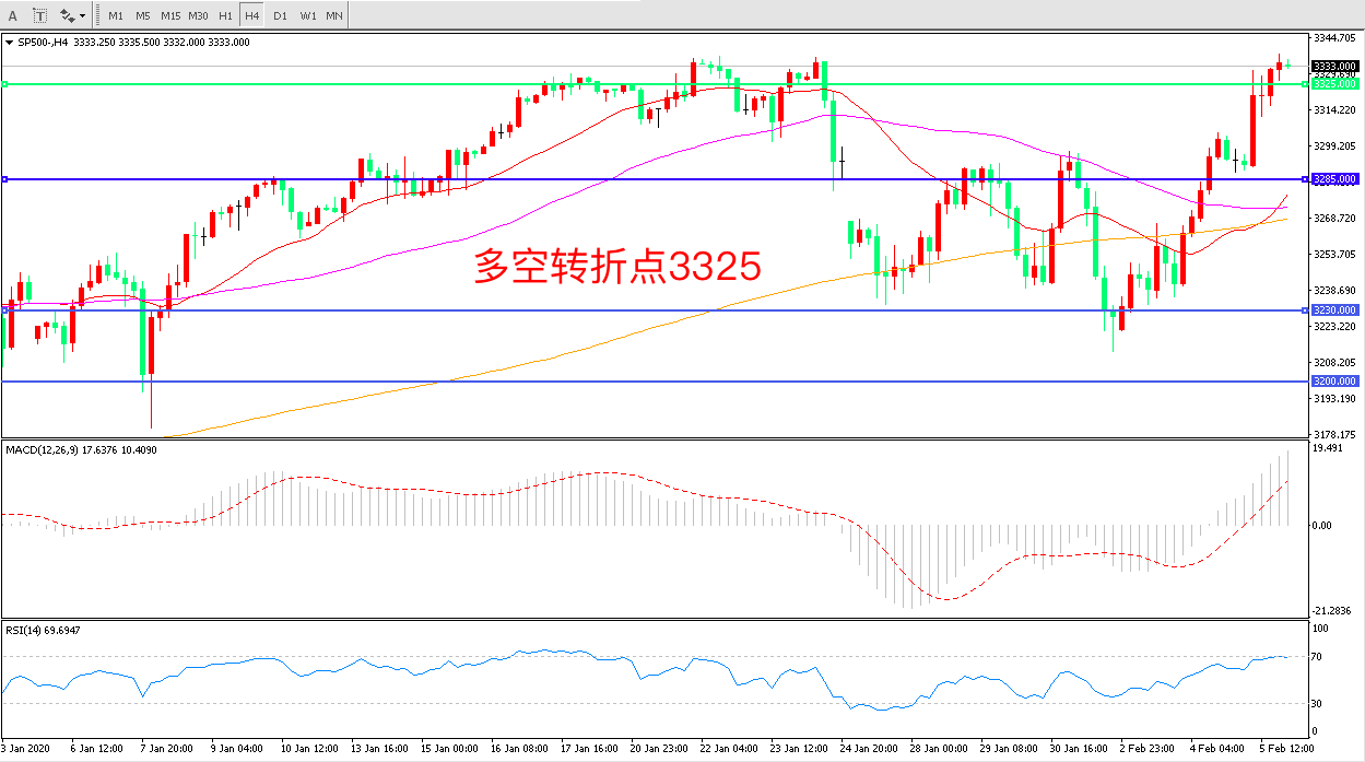 4小时图看,标普长阳连续拉升逼近前期高点短期均线拐头MACD红柱增加,RSI指标走平,日内延续上行概率较大