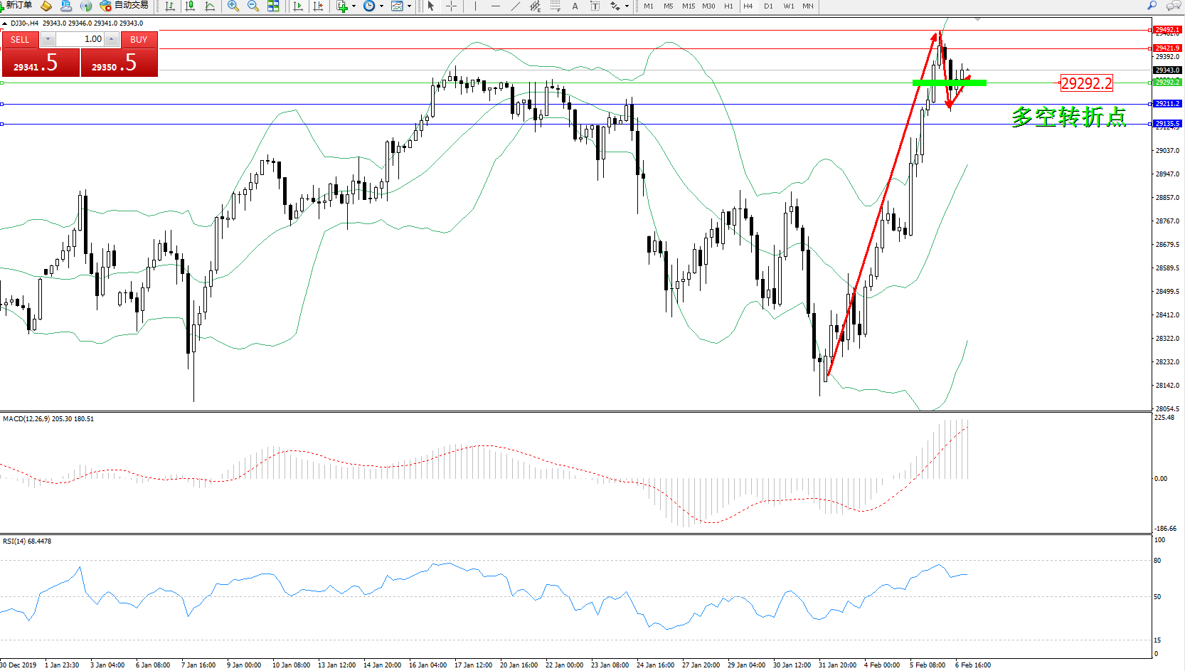 技术点评:多头动力延续布林带指标上轨强势拉升上行,突破前期高位遇阻出现震荡回撤走势,但上行趋势未有改变,布林带指标通道向上移动仍有拉升潜力,MACD指标处于多头区域高位整理平移中,RSI指标处于多头区域高位震荡回撤后持续平移;