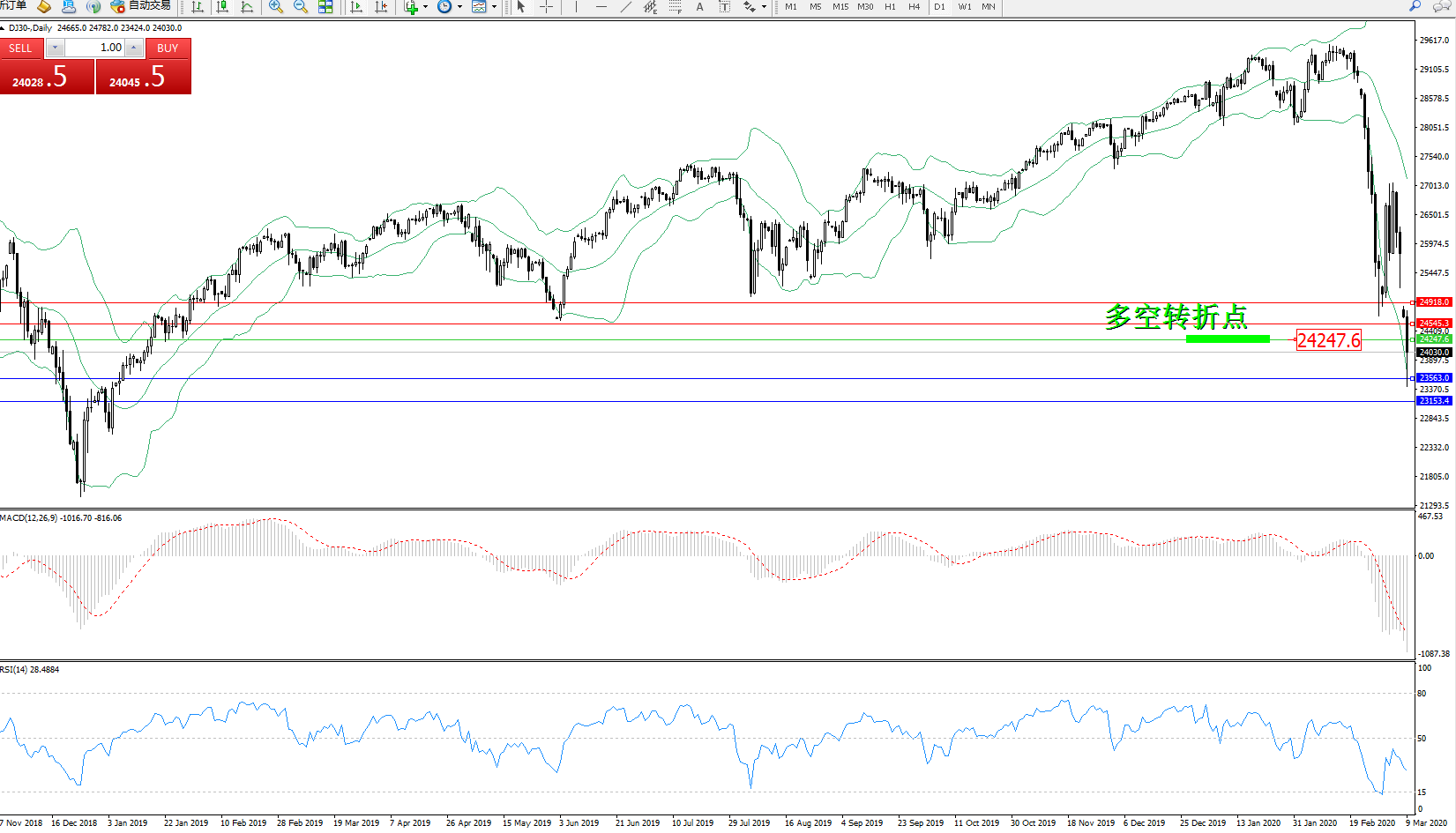 道琼斯指数39日(周一)收盘下跌2014.00点,跌幅7.79%,报23850.79点。欧美股市暴跌,美股触发熔断,道指收跌逾2000点;全面石油价格战让已经面临公共卫生事件的金融市场雪上加霜。 市场开盘即重挫,4分钟内跌幅达到7%,触发了纽约证券交易所熔断机制,交易暂停了15分钟。全球两大石油生产国之间爆发全面价格战,令卫生事件引发的担忧更加严重,并且突然之间改变了美元的动能。不到三周前,一个美元走势指标还处在两年多以来的最高水平,但是在急剧下滑之后,那些押注美元走弱的人现在看到了进一步下跌的机会。