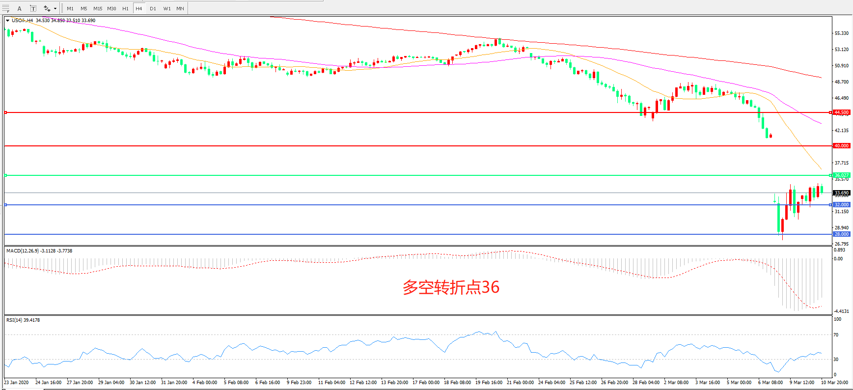 4小时图看,美油大幅低开后震荡回升,短线有止跌迹象,如能突破36美元一线,有望回补缺口,均线系统呈空头排列,MACD绿柱减少,RSI指标走平,日内延续震荡概率较大,中期走势仍然偏空。