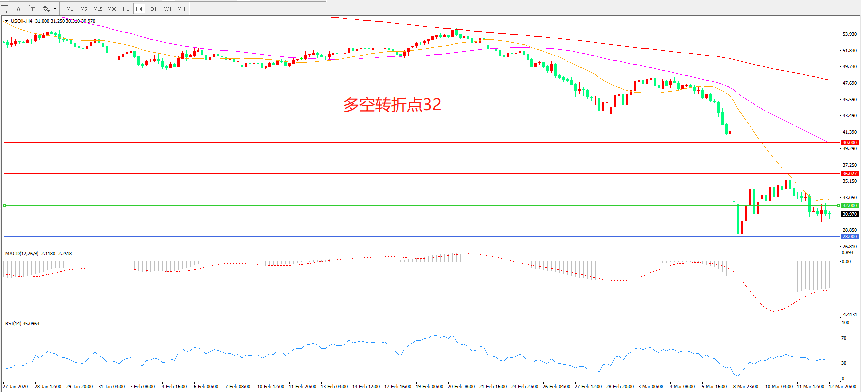 4小时图看,美油延续低位震荡,整体波幅不大,32美元成为短期多空分水岭,均线系统呈空头排列,MACD绿柱减少,RSI指标走平,延续震荡概率较大,短期反弹有望出现,中期走势仍然偏空。