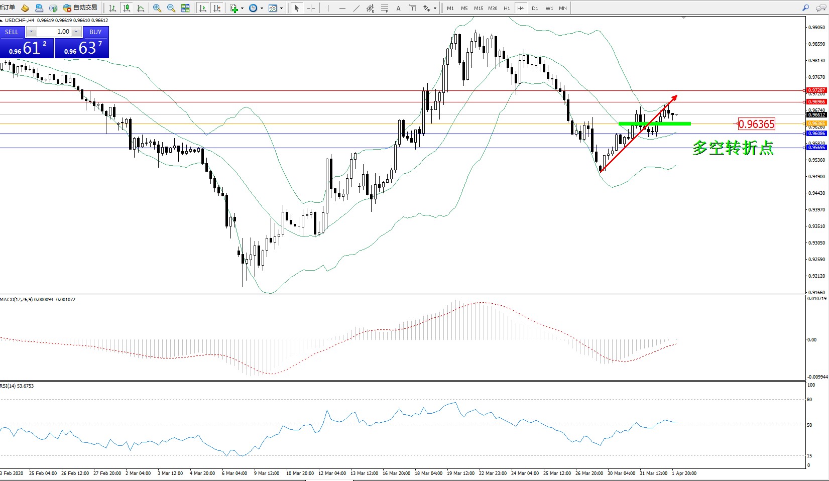 交易策略:0.96365上方看涨,目标0.96966、0.97287