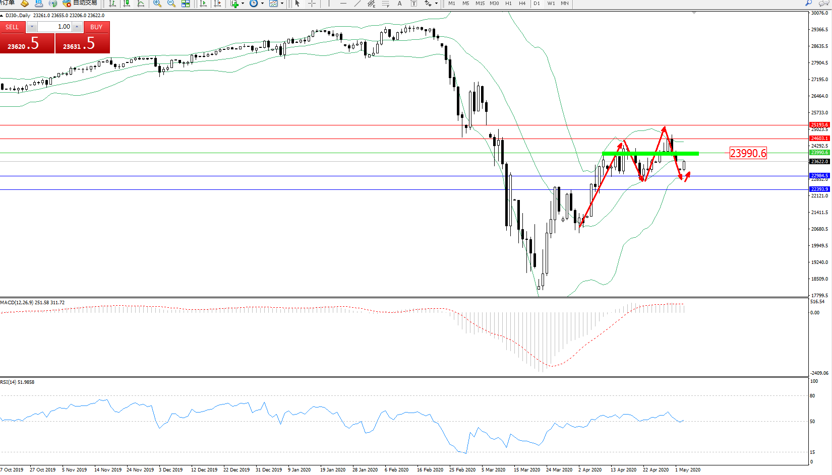 道琼斯指数DJ30—— 日K线图显示: