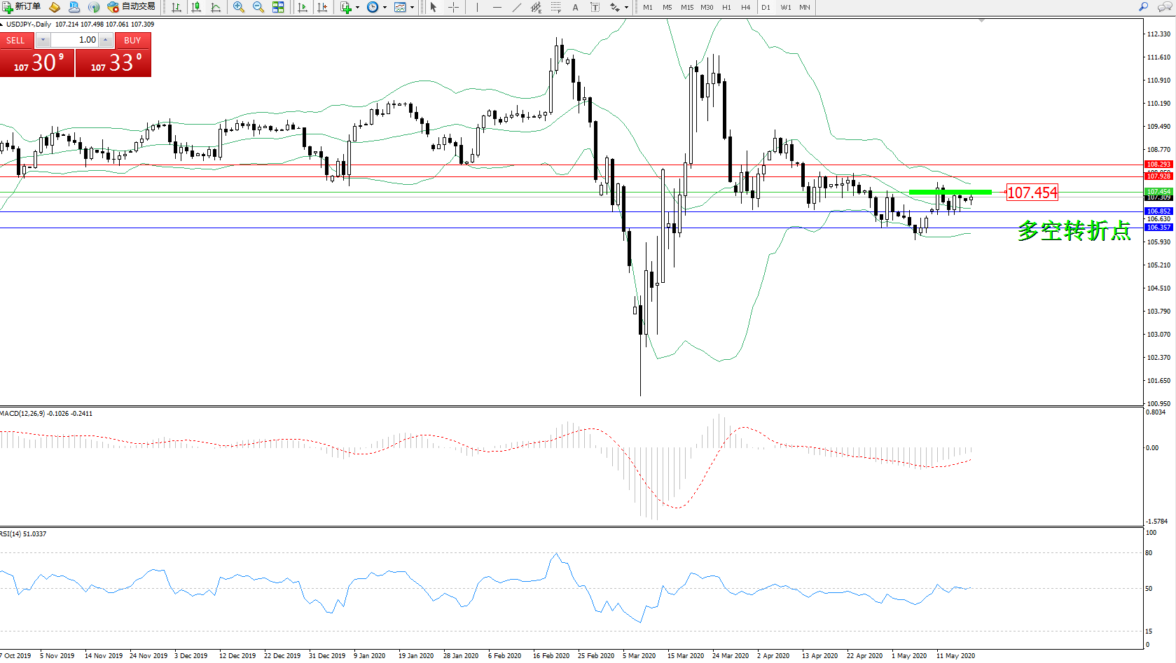 交易策略:107.454下方看跌,目标106.852、106.357