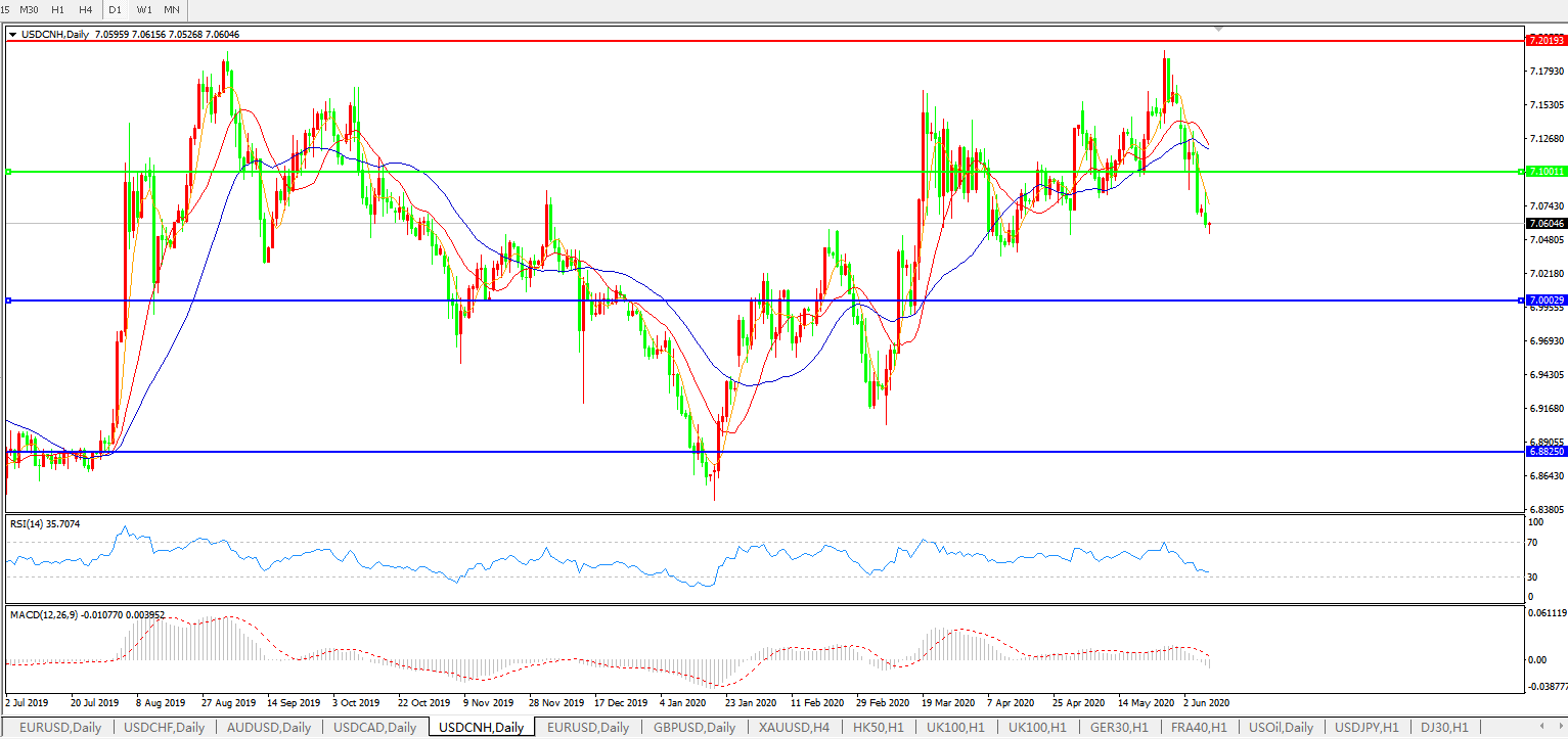 技术面简析:日图均线呈有序空头排列,汇价跌破7.10关口后持续下行,MACD开始走弱且量能0轴下放量,RSI持续走低,预计短期汇价或将进一步下行,关注7.00关口支撑。