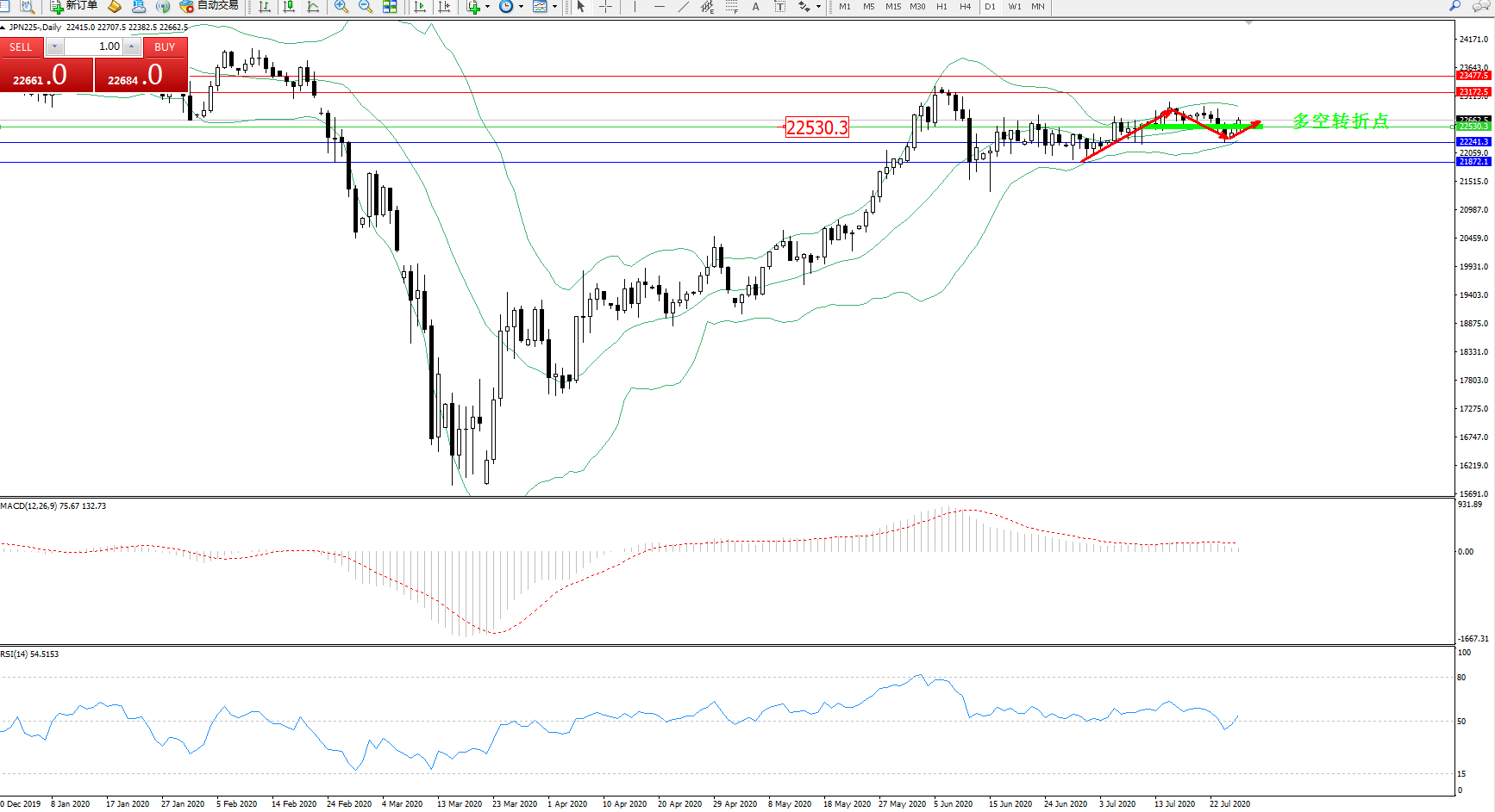 日经225指数7月27日(周一)收盘下跌61.11点,跌幅0.27%,报22690.50点。全球疫情继续恶化,日本投资者也可能会观望,而不是急于投资海外,因为美国收益率如此之低;只要有对美国经济复苏的期望,并且美国股市虽有调整仍保持高位的话,如果国际紧张局势急剧升级,或者美国数据持续显示复苏停滞,这将使美国收益率走低,国名义收益率下降将在中期刺激美元抛售,抛售美元的因素正在增加:美国实际利率下降、国际紧张局势加剧以及对美国经济的担忧。