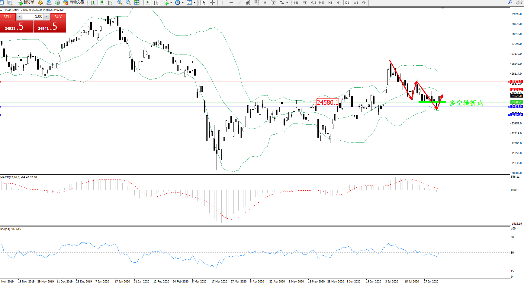 香港恒生指数8月4日(周二)收盘上涨488.5点,涨幅2.0%,报24946.63点;港股三大指数走高,午后现直线拉升,香港本地股午后直线拉涨带动大市走强,九龙仓集团大涨超9%,莎莎国际大涨8%;大型科技股亦走强,美团大涨8.6%再创新高,市值逼近1.3万亿港元,阿里巴巴涨3.3%,腾讯涨2%;今日南下资金净流入46.11亿港元,大市成交额为1459亿港元。据香港电台,香港特区卫生防护中心传染病处主任张竹君表示,香港新增确诊病例80例,连续第二日降至两位数,其中本地确诊75例。香港累计报告新冠肺炎确诊病例3670例。