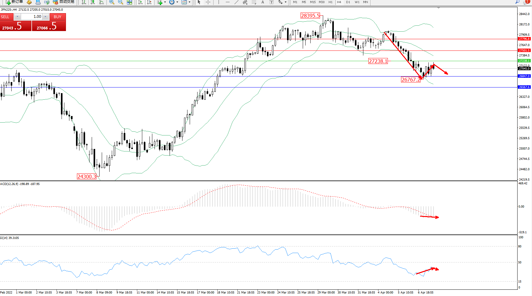 技术点评:空头动力延续布林带指标通道下轨附近持续下挫,低位抵达26767位置后整理,短期低位有多头伺机入场迹象,但市场整体下行趋势或将延续,布林带指标呈张口走势持续中,MACD指标处于0轴线下方弱势徘徊中,RSI指标处于空头区域维持整理上移后徘徊;