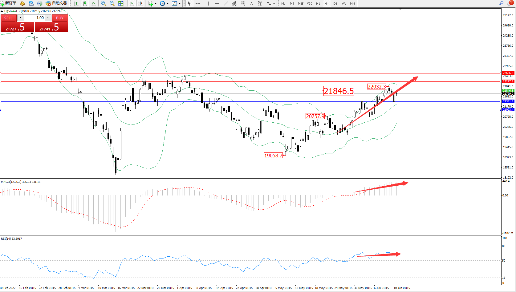 技术点评:多头动力延续布林带指标通道中上轨区间持续震荡拉升上扬,高位抵达22032附件节点后遇阻调整,短期上行趋势依旧,布林带指标呈上行趋势后开始收口,MACD指标处于多头区域维持缓慢上移,RSI指标处于多头区域维持整理平移;