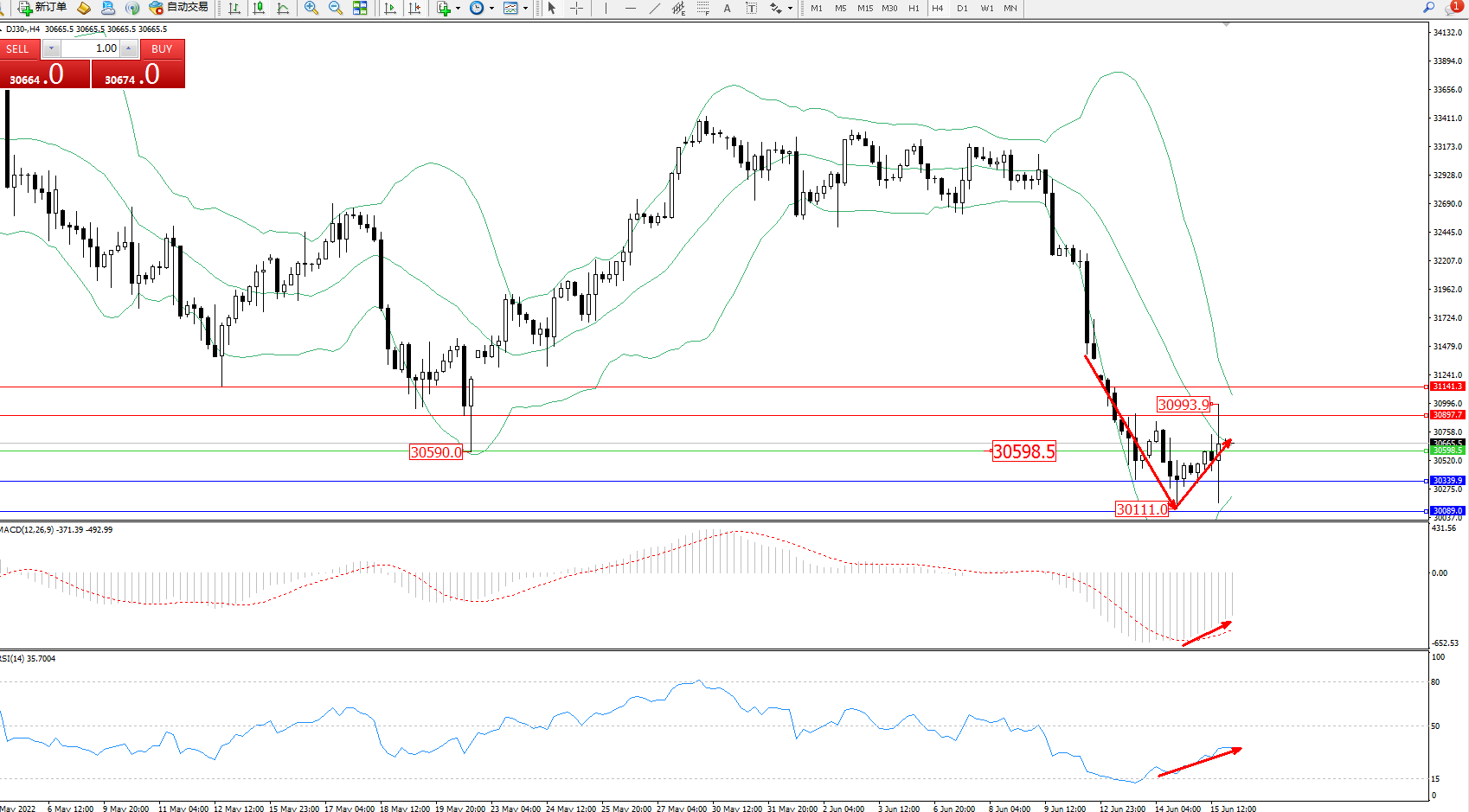技术点评:空头动力延续布林带指标通道中下轨区间持续震荡下行,低位抵达30111附近节点后开始饭震荡上扬,布林带指标呈收口走势持续中,MACD指标处于空头区域低位维持震荡缓慢上移,RSI指标处于空头区域维持震荡持续向上移动在;