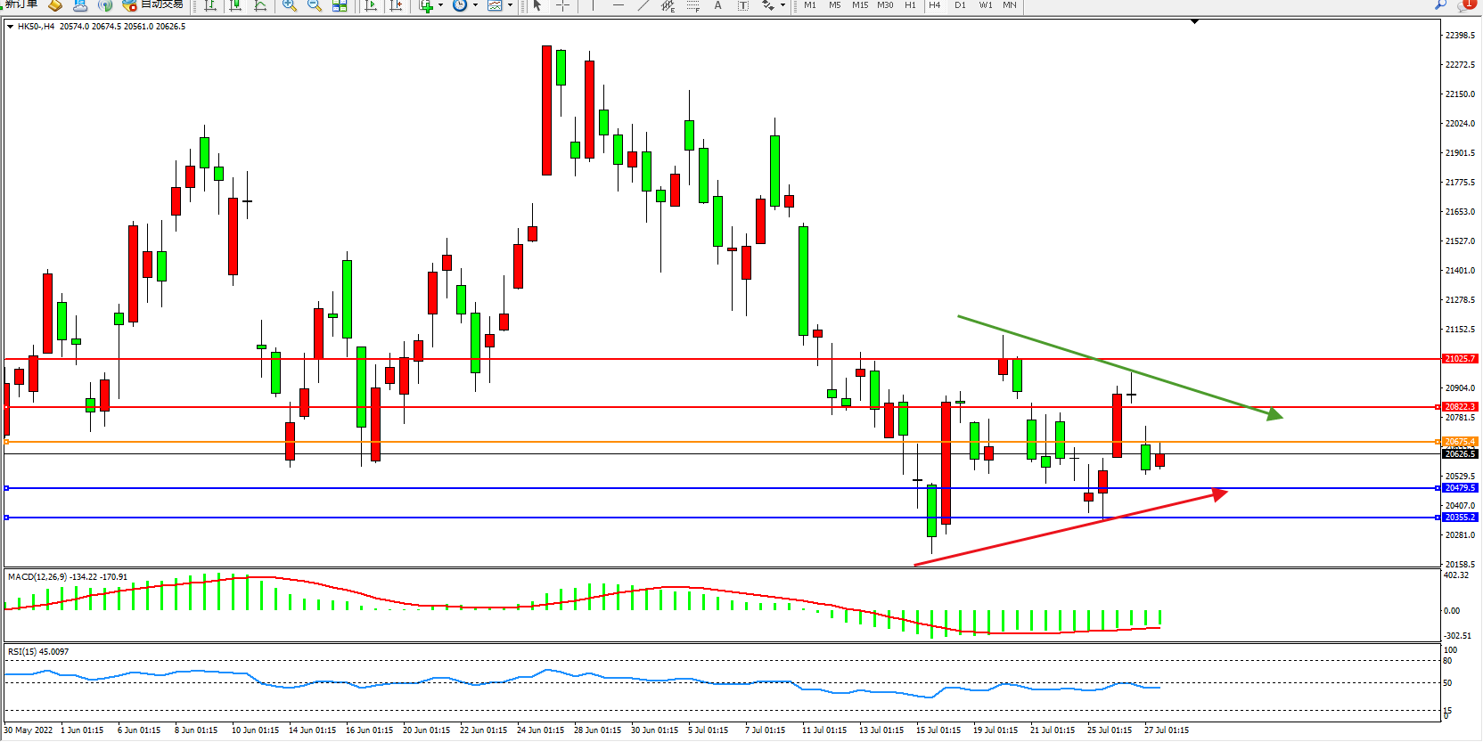 香港恒生指数7月27日(周三)收盘下跌235.84点,跌幅1.13%,报20670.04点;昨日美股收跌,市场焦点转向美联储决议。港股全天表现弱势,恒生科技指数跌1.3%。权重科技股纷纷走低,阿里巴巴跌超3%,百度、腾讯跌2.7%,小米、京东、网易皆下跌;香港财政司司长:香港最优惠利率在未来数月可能上调。